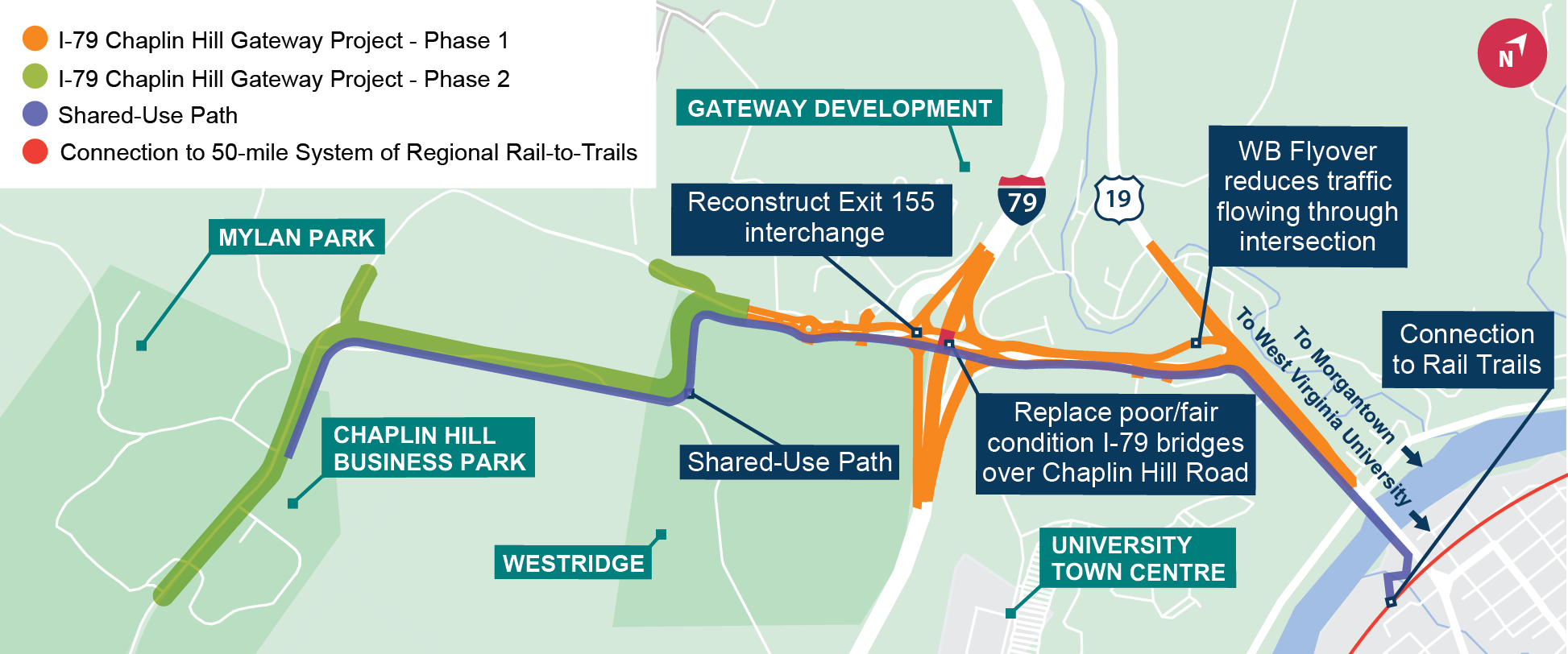 The I-79 Chaplin Hill Gateway Project is a partnership between the Monongalia County Commission, the West Virginia Department of Transportation, local non-profits Mylan Park Foundation and the Mon River Trails Conservancy, and private enterprise, with the shared goal of improving capacity, safety, multi-modal access, and growth opportunities in north central West Virginia.